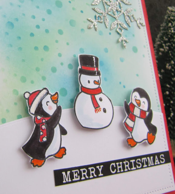 Created the background using Simon Says "Falling Snow " stencil and Cracked Pistachio and Salty Sea Distress Oxide ink. Added the Simon Says die cut snowflake and pop dotted the penguins and snowman. Decided to use a red card blank for extra colour.